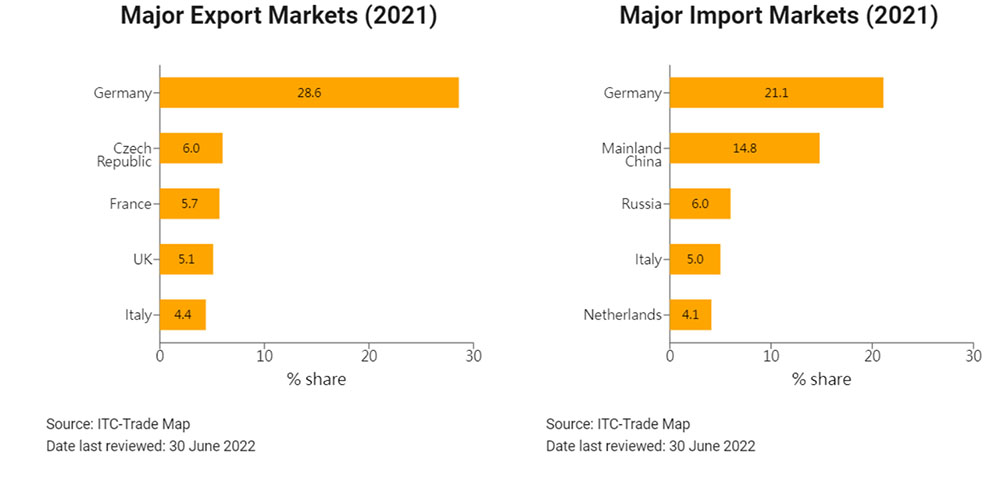 波蘭的主要貿(mào)易伙伴集中于歐洲地區(qū),2021年德國仍是波蘭最大貿(mào)易伙伴、最大出口市場和最大進口來源地。中國是波蘭第二大進口來源地。